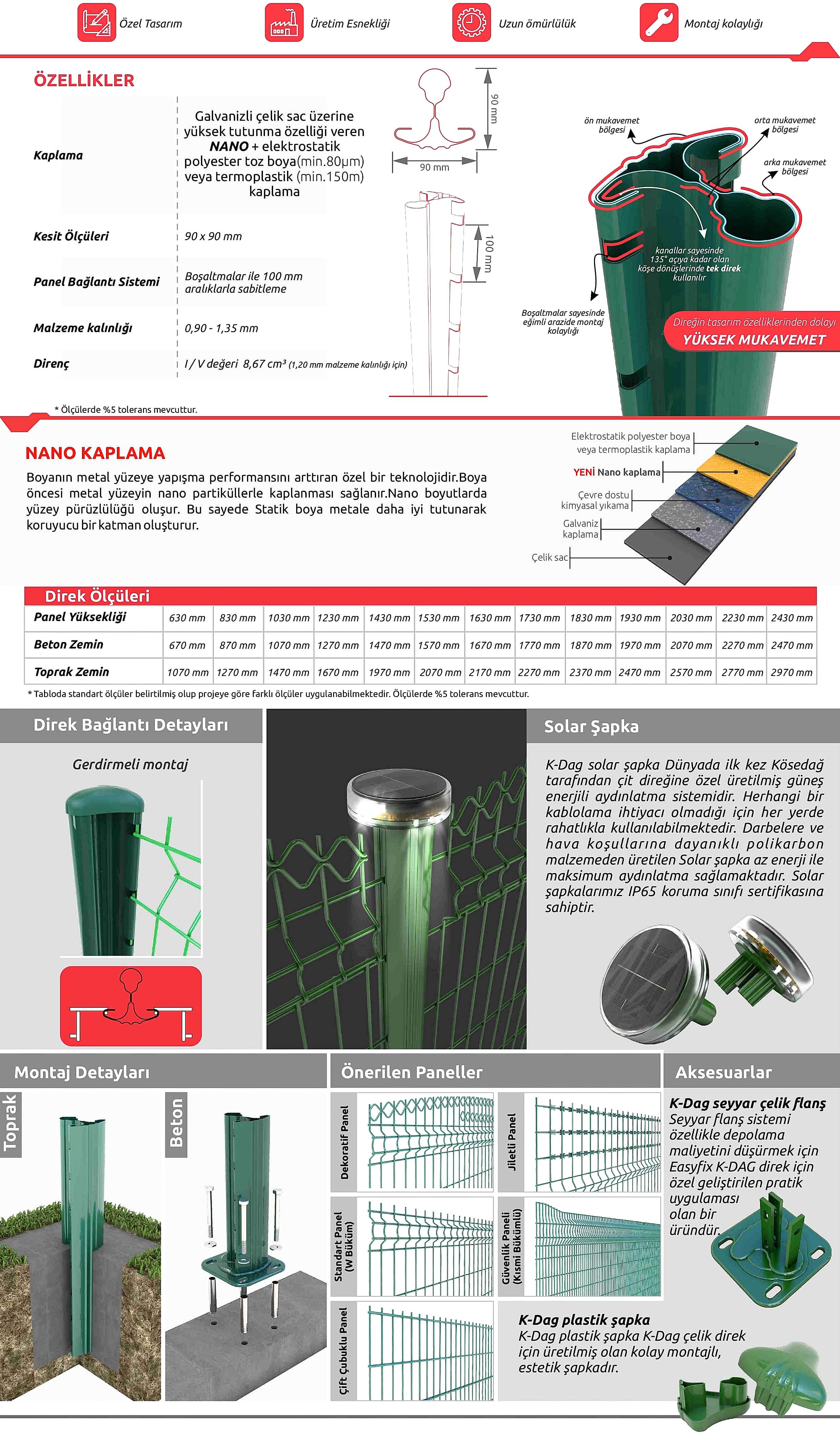 K-DAG Metal Direk, özel kesit yapısı sayesinde panelin direk kanatlarına geçmeli şekilde montajını sağlayan, mukavemmeti arttırılmış direk sistemidir. Tüm panel çeşitleri ile uyumlu şekilde kullanılabilir. Çift katmanlı özel tasarımı sayesinde yüksek direnç, mukavemet ve montaj kolaylığına sahiptir. Direk kanatlarına geçme özelliği sayesinde bağlantı elemanı gerektirmez. Özel geçmeli sistem, panelin sökülmesini engeller ve dış güvenlik tehditlerine karşı ekstra koruma sağlar. Panelin direğe montajında delik delme işlemi olmadığı için korozyon direnci yüksektir. Uzun ömürlüdür.Tek bir sac levhadan üretilmesi ile kesme, kaynaklama, kelepçeleme vb. yöntemlere dayanan geleneksel tekniklerdeki kayıpları ortadan kaldırmıştır. Montajda delme işlemi gerektirmediği için kaplama zarar görmez. Direk kanatlarındaki boşaltmalar sayesinde eğimli arazilerde montaj kolaylığı sağlar. Köşelerde ve dönüşlerde ekstra direğe ihtiyaç kalmamaktadır. Standart sistemde plastik şapka ile kullanılan K-DAG Metal direkte alternatif olarak solar şapka eklenebilir.